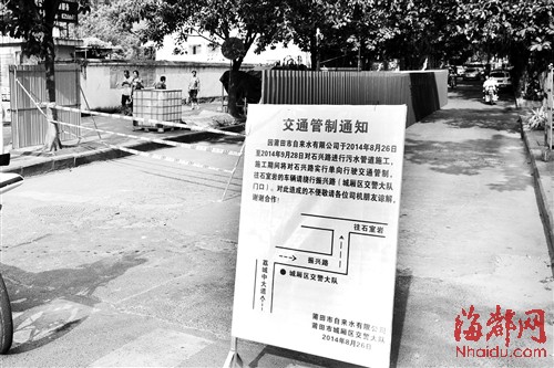 石兴路临时单向管制 东南网9月2日讯(海峡都市报记者 李伟强 马俊杰 文/图)“石兴路怎么变成单行车道了,那去石室岩要怎么办?”昨日,有读者反映,莆田石兴路突然开始单向行驶管制,路口还有民警执勤。记者在现场了解得知,石兴路因污水管道改造施工需要,需要临时单向行驶管制,市民前往石室岩可绕行振兴路。 昨日上午9时许,记者来到荔城大道与石兴路交叉路口,一民警在该路口执勤,石兴路上有三处路段已被围挡,围挡占去过半道路,仅能容纳一车单向通行。记者发现,荔城大道沿路设置了不少提示牌,即日起至本月28日,莆田市自来水公司将对石兴路进行污水管道施工,施工期间将对石兴路实行单向行驶交通管制,前往石室岩的市民可绕行振兴路。随后,记者试着从振兴路绕行,虽然要多绕行几个弯道,但一路下来很顺畅。 |