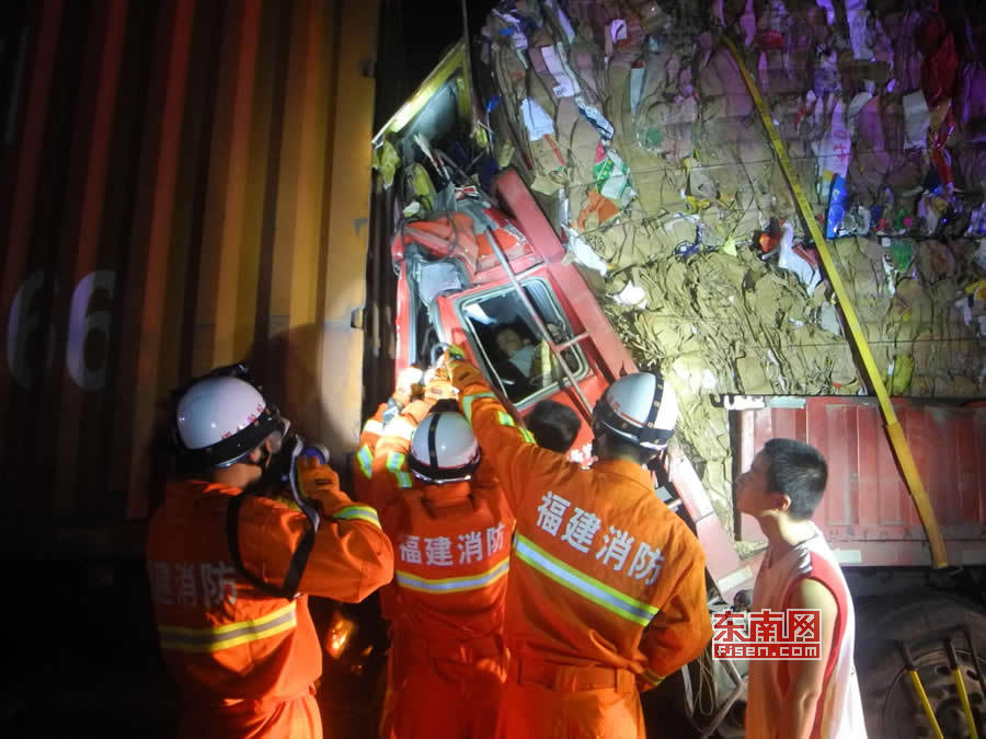 9月27日凌晨4时,莆田西高速路口发生一起车祸,一辆货车与一辆大挂车发生追尾,致使大挂车车头严重变形,驾驶员被困车内。