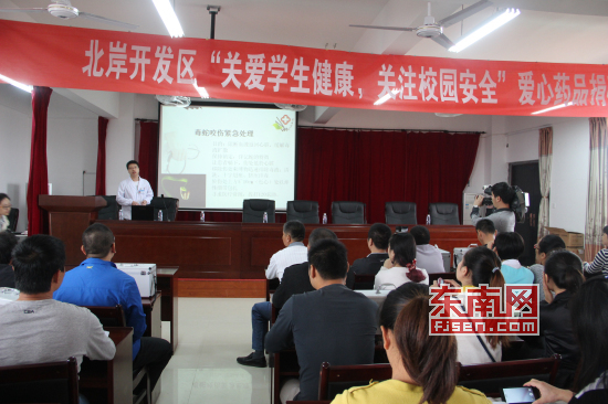“校园急救小知识”讲座 东南网莆田11月11日讯(本网记者 陈淑霞 董太领)上午,北岸食药监分局与该区教育局、忠门卫生院在北岸实验小学联合开展“关爱学生健康、关注校园安全”——学校医务室小药箱赠送活动。现场共向全区41所小初高学校赠送常用乙类非处方药20个品种及药箱百余个,总价值4万余元。 北岸食药监分局局长王金宏介绍,自该分局成立以来,校园饮食用药安全已被作为该局日常工作的重中之重。“在10月份‘药品安全月’进校园系列活动及校园周边食品药品安全整治检查中,我们发现全区学校大部分无医务室、常用急需药品匮乏。随后,我们联系了相关职能部门及莆田市2家药品批发企业,他们也积极响应配合。我们希望通过这样的爱心捐赠,让师生在校内就可实现有药可用,确保师生用药安全、及时。” 据悉,参与本次药品捐赠的两家爱心企业为康利医药有限公司及大同医药有限公司。捐赠仪式结束后,忠门卫生院医护人员为辖区内校医人员讲授了“校园急救小知识”讲座并开展校园义诊。