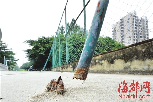 体育场前广场,支撑铁网的撑杆或断裂,或已被扭弯变形 东南网11月27日讯(海峡都市报记者 蔡学伟/文 马俊杰/图)年仅1周岁的女童小菲,在莆田市综合体育馆前的广场,误触灯罩破损景观灯,不幸触电身亡。消息见报后,引起社会各界广泛关注。 小菲的死深深刺痛了人们的心。莆田究竟还有多少处存在安全隐患的公共场所,这些场所是否有人管理?本报即日起推出“寻找安全隐患 守护身边安全”栏目,和您一同查找公共场所的安全隐患。 体育馆前广场 居民称多次反映不见有人来修灯罩 昨日上午,记者再次走访事发的综合体育馆前广场和附近的莆田市体育场前广场,发现这两个同属于体育中心的广场内,还存在着多处安全隐患。景观灯罩破损,电线裸露的情况,随处可见。一些绿化树和场馆设施,也暗藏着“杀机”。 在莆田市体育场前广场的一个角落,几面高约4米的铁栅栏围起一块沙排场地。其中一面栅栏由5根铁管支撑着,这些铁管大都锈迹斑斑,有的已弯曲变形,还有一根铁管已从地点的支点脱离。这些支架能否安全支撑每面重达数百公斤的铁栅栏,让人怀疑。 在综合体育馆前的广场,记者除在树池内发现多盏破损的景观灯外,在没有任何防护设施的绿地上,也看到了几盏外罩破损、电线裸露的景观灯。几棵广场绿化树上,原本用来固定树木的铁丝已经断裂,缠绕在树干上。这些铁丝距地面不过1.4米左右,很容易刮伤行人的脸部和身体。 家住体育中心附近的居民说,上述情况已经出现了较长时间,他们也多次向相关部门进行过反映,却一直没有见到有人前来查看和修理。这些广场上的设施,究竟分属于哪些部门,是否有人管理,一直也说不清楚。女童被电亡事故发生后,有人切断了景观灯的电源,但这些破损的设施亟待彻底修复,才能避免悲剧再次发生。