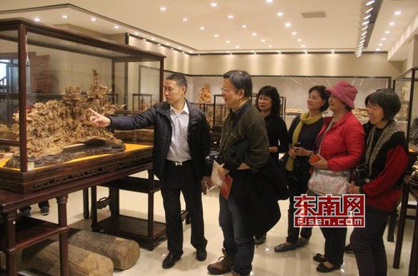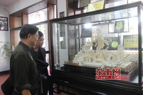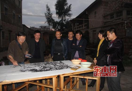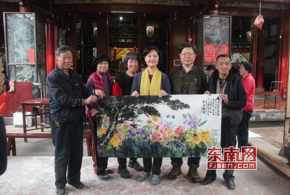 欣赏牙雕作品《湘云醉卧》 东南网莆田12月16日讯(本网记者 吴炳端)“近几年,荔城变大了,生态变美了,环境变优了,莆田人文昌盛,交通发达,是宜居宜商的优美城市。”日前,台湾艺术家李淑英女士对莆田如此评价。为了更好宣传文人莆田、生态莆田、美丽莆田,荔城区台办和台湾中华现代国画研究学会、台北国画创作研究学会联姻建立莆台两岸书画艺术采风创作基地,把最美的莆田献给两岸人民。 12月10日,台湾中华现代国画研究学会理事长陈铭显教授,台北国画创作研究学会第三届理事长、中华现代国画研究学会秘书长黄金治女士,台北国画创作研究学会第四届理事长吴珠美和第五届理事长李淑英等一行,来到莆田荔城区进行采风创作,并与当地书画家现场开展联谊笔会等一系列活动。采风团团长陈铭显教授说: “采风团这次到莆田采风,就是希望把莆田深厚的人文景观、独特的民风民俗和日新月异的变化,用艺术的形式创作出来,奉献给台湾人民,增进两岸人民民族感情。” 采风团首先参观了莆田工艺美术城。台湾艺术家对牙雕《湘云醉卧》表现出的精湛技艺和传神意境情有独钟;在李凤荣大师工作室里,木雕《妈祖巡游》作品让人深刻印象。台湾艺术家王先生感慨地说: “以前认为台湾雕刻艺术水平在国际上是一流的,来莆田一看,发现莆田的木雕更生动,更传神,回去一定请木雕界来莆田交流取经。” 之后,采风团又前往莆田荔城黄石江东村和北高美澜村。江东村独特人文景观、十里水乡和北高美澜村古榕景区也深深地吸引采风团。在江东村浦口宫,采风团和当地书画家联合创作了《锦绣荔城》和《彩墨莆田》,表达对美丽莆田地由衷祝贺。最值得一提的是,采风团在美澜村的古榕树景区写生时,画家们以《同根相连》为题写生创作,表达大陆和台湾同根同源,血脉相连的命运共同体,点出这次来莆采风主题。创作完毕,画家们将现场创作的《同根相连》中国画作品赠与美澜村,衷心祝愿两岸人民和平友谊,共赢发展。 采风结束后,中国楹联协会会员,荔城区书法家协会副主席江国兴对东南网记者说:“这两年来,我参加过荔城区台办组织的三场当地艺术家与台湾艺术家一起下基层艺术采风和书画笔会,觉得这项工作接地气。一方面,把美丽莆田推广出去,让更多台胞了解莆田,热爱莆田;另一方面,用高雅艺术笔会来联络两岸人民感情,这样的情感更深入人心。”