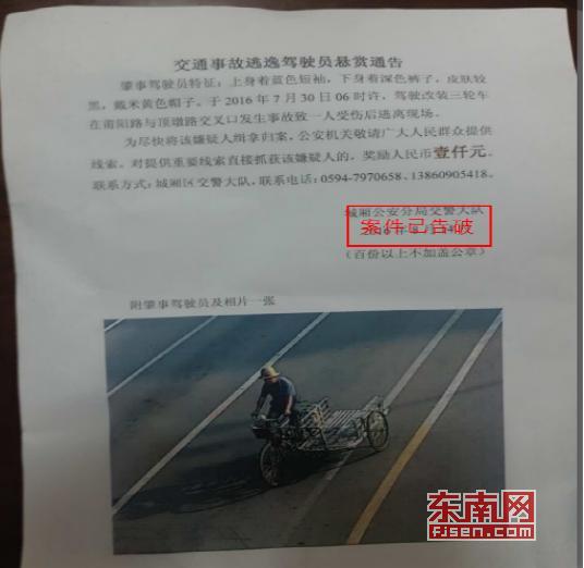 交警准备张贴的悬赏通告 东南网莆田8月19日讯 三轮车与摩托车相撞,摩托车司机受伤,三轮车驾驶员虽将其送至医院治疗,但未向警方报案,且无故离开了医院。近日,莆田城厢交警大队正准备张贴“交通事故逃逸驾驶员悬赏通告”时,凑巧就遇到了这位肇事的三轮车驾驶员。 7月30日早上6时许,在城厢区凤凰山街道天九湾菜市场,一辆电动三轮车与一辆摩托车相撞,导致摩托车驾驶员受伤。三轮车驾驶员将摩托车司机送至市医院治疗。城厢区交警事故处理中队接报后,赶到医院却发现三轮车司机已经不在医院,且未留下任何联系方式。 事后,城厢交警通过监控视频跟踪至男子最后出现的荔浦小区。8月14日上午,事故处理中队的民警正准备在该小区附近张贴告示时,三轮车驾驶员就出现在民警的眼前,该该案件得以告结。 城厢交警提醒广大群众,发生交通事故,交通事故当事人虽将伤者送到医院,但未报案且无故离开医院的行为,也属于交通肇事逃逸。 |