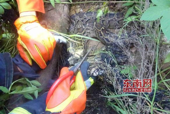 蟒蛇被网卡住受伤