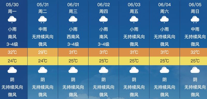 未来一周天气预报图(来源:中央气象台) 同时,莆田的气温也在迅速抬升。预计最高温维持在30℃以上,最低温25℃左右。具体预报如下,30日,小雨转阴,24~32℃;31日,中雨转阴,24~29℃;1日,小雨转阴,25~31℃。 炎炎夏日已到来,市民朋友们要注意防暑降温,及时补充水分,昼夜温差较大,谨防感冒。另外,近期多降雨,外出要随身携带雨具。 |