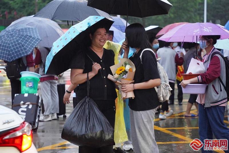 家长给孩子送上鲜花 东南网莆田6月9日讯(本网记者 江瑞鑫 吴炳端 卢建伟 文/图)今日下午,随着高考最后一科生物考试的结束,为期3天的福建省2022年高考正式落下帷幕。 当天下午,天空还下着雨,东南网记者在莆田一中、仙游一中、莆田四中考点看到,考生们迈着自信的步伐走出考场,在雨中守候的家长们第一时间给孩子送上鲜花和拥抱,庆祝高考顺利结束。