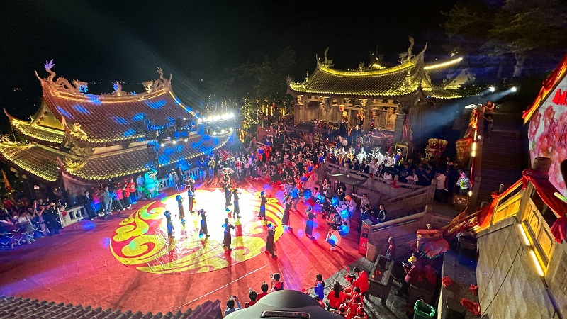 民俗文艺踩街队伍 上午9时许,鸣锣开道,哨角长鸣;仪仗威严,声震八方。各妈祖宫庙及妈祖敬仰者近万人组成的民俗队伍护送妈祖銮驾,从妈祖健康城出发一路踩街表演至贤良港天后祖祠广场,长长的民俗文艺踩街队伍似一条巨龙蜿蜒穿梭于街巷中,蔚为壮观。 上午11时,贤良港天后圣殿朝圣广场上千名妈祖敬仰者有序列席参加祈福大典。司仪宣布“鸣礼炮”,主祭人贤良港天后祖祠董事会董事长林自弟领信众向妈祖行三叩九跪诸礼;礼毕后宣读祭文,行五献礼,焚金帛;锣鼓大作、鞭炮齐鸣,整个仪程庄严隆重。活动现场还直播连线四海同胞,云端同拜妈祖,共祈国泰民安。
