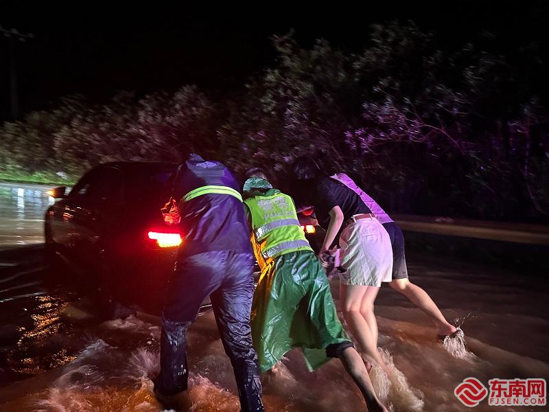 7月28日晚,仙游县公安局郊尾派出所民警帮助群众将泡水熄火车辆转移至安全地带。(仙游公安 供图)