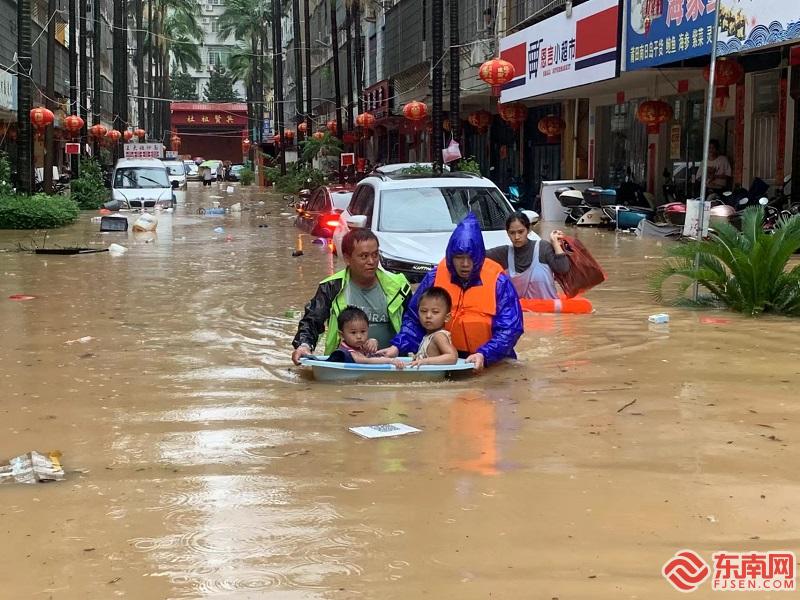 7月28日,莆田市公安局凤凰山派出所民警对积水严重的受困群众进行转移。(城厢公安 供图)