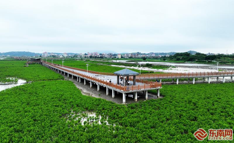 东南网莆田8月22日讯(本网记者 吴炳端 文/图)漫步在莆田市荔城区黄石镇东山村龙头山栈道,木兰溪入海口赫然入目,陆地与海洋的交接处,茂盛的红树林点缀着海岸线。葱郁的红树林间,不少白鹭或翱翔上空,或在林间觅食。村民在凉亭休闲聊天,游客则不时用手机拍下白鹭翱翔的身影。