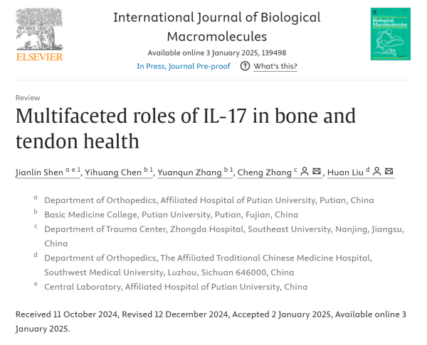 论文图示(莆田学院附属医院 供图) 东南网莆田1月10日讯(通讯员 沈剑粦 李金秋 阙丽君)近日,莆田学院基础医学院临床医学专业23级本科生陈艺煌和张苑群,以共同第一作者在国际学术期刊International Journal of Biological Macromolecules(中科院1区,IF:7.7)在线发表题为Multifaceted roles of IL-17 in bone and tendon health的综述性文章。指导老师均来自莆田学院附属医院,沈剑粦教授为第一作者,刘欢教授为通讯作者。 白介素17(IL-17)家族作为重要的细胞因子,在生物医学的各个领域发挥着关键作用。这篇文章深入探讨了IL-17家族成员在骨愈合、肌腱骨化和衰老中的多方面作用,为相关领域的研究提供了新的视角和理论支持。
