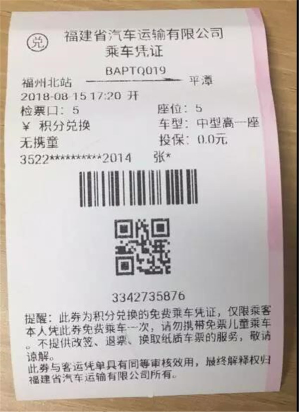 免费兑换的乘车凭证 此乘车凭证不能携带免票儿童,不能退票、改签,不能换取纸质车票。兑换完毕后必须按凭证时间乘坐,逾期作废。 参与积分及兑换的线路 平潭至福州南站、福州南站至平潭,平潭至福州北站、福州北站至平潭,平潭至福州西站、福州西站至平潭。 相关小问答 问:什么时候开始算积分呢? 答:2018年8月1日之后购买的平潭—福州的车票都累计积分。积分记录满一年后自动清零,次年再重新累计。 问:如何积攒与查询积分呢? 答:凭本人身份证购买平潭—福州的车票,往返都可积分。在车站内的飞猪售票机,刷身份证可以查询积分次数。 问:微信上购买的车票可以累计积分吗? 答:以本人身份证购买的参与线路车票为准,手机、窗口、网络购票均可累计积分。 |
