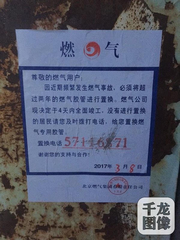 近日,有网友反映看到一则落款为北京燃气集团有限责任公司的公告。图为要求燃气用户置换胶管的公告。