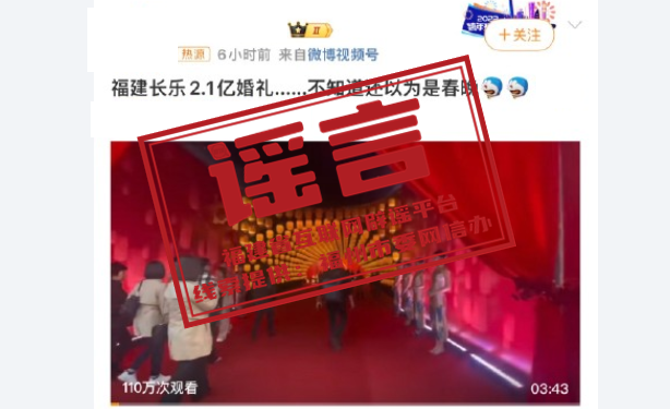 近日,有个别网络账号在社交平台上传播“福建长乐2.1亿婚礼”“老凤祥董事长儿子和莆田叶府豪门婚宴,斥资2.1亿打造婚宴”等信息,并配有奢华婚礼现场视频,引发网民关注。