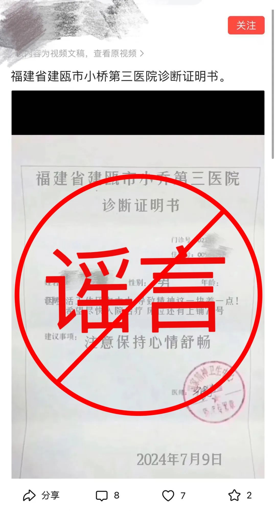 今年7月,叶某在网络上发布信息晒出一张自己精神疾病证明,标题称“福建省建瓯市小桥第三医院诊断证明书。”经公安机关核查,该信息所描述事件为叶某虚构编造,叶某为博取关注、吸引流量,将“建瓯市小桥第三医院诊断证明书” P上自己的名字发布在某平台。目前,公安机关已依法对叶某予以行政处罚。
