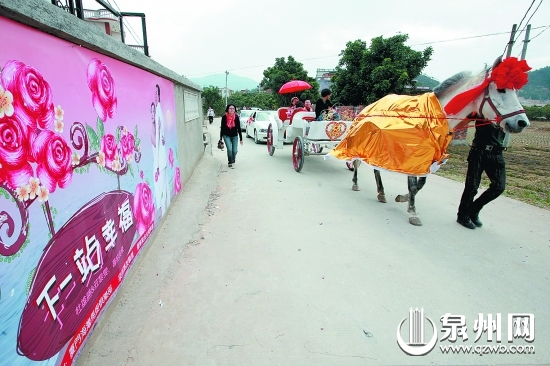 “玫瑰花,你的;巧克力,你的;钻石,你的;你,我的。”……类似的爱情宣言,被“刻”在婚纱海报上,一张张贴在通往洛江区马甲镇前垵村杜雄胜家的邻屋墙壁上。