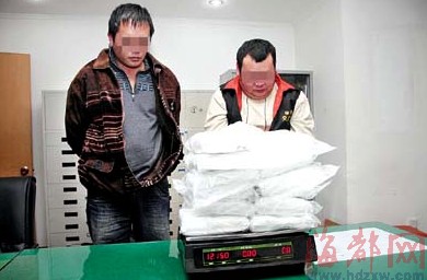 在大量毒品前,两名台湾男子低下了头