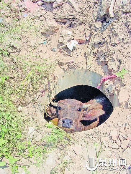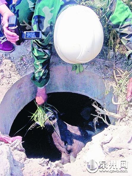 牛掉进无盖窨井3天 主人支起三脚架将牛吊出
