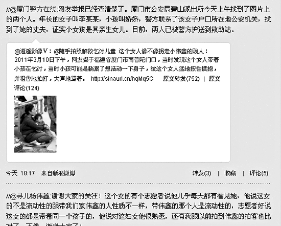 “重大发现!这个女人很像拐走小伟鑫的人贩子!”昨日,有网友通过微博发布信息称,在厦门南普陀门口一位带小孩行乞的女人酷似当年带着杨伟鑫乞讨的那个女人贩子。杨伟鑫母亲洪佩评获悉很兴奋,立即通过当地志愿者报警求助。
