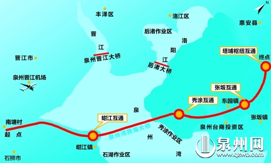 根据批复,泉州湾跨海大桥起于晋江新塘镇南塘村,接在建的泉州环城高速公路晋江至石狮段,于蚶江跨越泉州湾,经秀涂,止于惠安塔埔,接在建的南惠高速公路,全长约27公里,其中跨海大桥约12.45公里,两岸接线长约14.7公里。全线采用高速公路标准建设,设计速度100公里/小时,其中蚶江互通至秀涂互通段采用双向八车道,其余路段采用双向六车道。项目估算总投资60多亿元,国家已安排中央专项基金(车购税)6.39亿元加以补助。