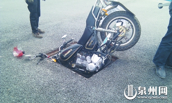 早报讯 (记者康云 文/图)马路上的窨井盖不翼而飞,骑摩托车的男子不小心一头栽进“陷阱”,人飞出去磕掉了几颗牙,摩托车则卡在黑洞洞的无盖窨井口。昨日下午1点半左右,这一幕就发生在厦门集美北站公交车广场附近一路口。