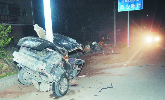 赶到第一现场的泉港消防大队队员说,他们接到一个王先生报警,出动了12名消防官兵赶往事发现场。“撞击太强烈了,已经看不出车了。”撞击后,轿车车头凹进很深,路灯杆嵌进去,几乎就像插在后排座上,一眼只看到车尾,看不到车头,整辆轿车严重变形。当时,一名年轻男子被甩出车外,已死亡;还有一名年轻男子被凹陷的车头紧紧卡住,还有微弱的呼吸,现场医护人员正给他输液急救。