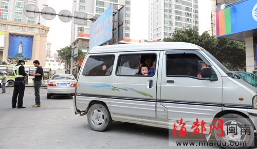 东南网-海峡都市报4月14日讯(本网记者 尤燕姿 吕波 文/图) 核载7人的面包车,充当校车运载幼儿园小朋友,却实载了16人,超载129%,将被罚款200元,扣3分。