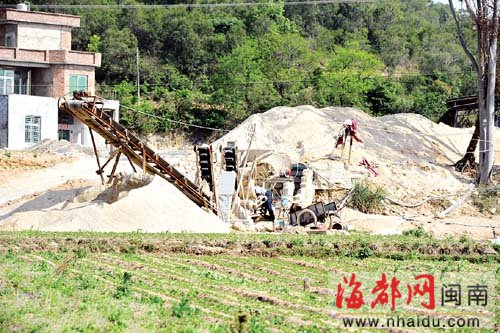 东南网-海峡都市报4月21日讯(本网记者 吕波 实习生 庄威 文/图) 村道的一边,是一片绿油油的农田,田中的灌溉井已几近干涸;而在另一边,是占地一千多平方米的洗沙场,场地中央的水池积满了水。