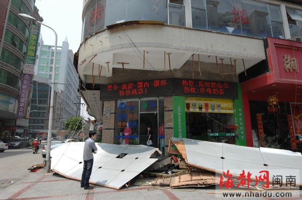 东南网-海峡都市报4月28日讯(本网记者 谭青 文/图) 事件实录:一个店面的广告牌突然松动,瞬间掉落在地面上(如图),将店面旁边停放的电动车和摩托车砸烂,路旁一人也被砸中,所幸只是受了轻伤,并无大碍。