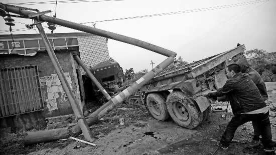 早报讯 (记者许钹钹 王柏峰 文/图)昨天上午,省道201线南安石井镇惜坂村复兴造纸厂旁。电力公司的施工车正在更换两根歪倒在房顶上的电线杆。前一天下午,该路段一辆货车与一辆油罐车相撞,同时撞断路旁两根电线杆,导致附近路段停电近6个小时,不少村民受到影响。