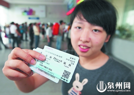 在高铁泉州站第一个买到6月1日动车票的旅客展示车票,车票正面左下方印有身份证号。(陈起拓 摄)