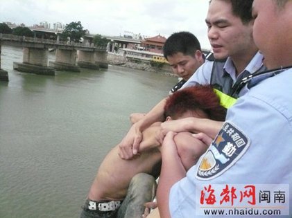 男子叫陈某超,南安霞美镇人,今年20岁。出警的柯警官说,昨日早上8点39分,他们接警赶到,发现陈某超爬到笋江桥栏杆外坐着,准备跳桥。劝说中,民警趁机拉住他的腰带,将他拉到岸边。