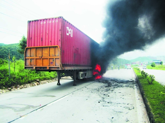 挂车载21吨废纸半路爆胎起火 司机拿矿泉水救火