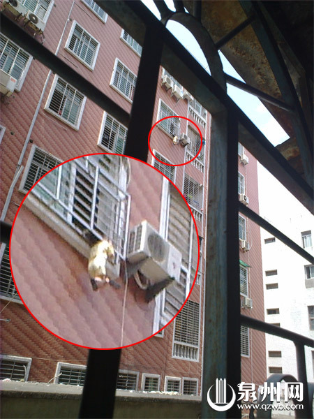 头卡防盗网 贪玩小男孩独自在家身悬6楼窗台(图)