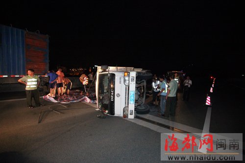 东南网-海峡都市报6月23日讯(记者 俞志村 黄谨 文/图) 前晚10时许泉三高速B道南安段,徐师傅满载一车瓷器,从德化赶往泉州,只听见“砰”的一声,货车晃了一下就侧翻了,两吨多的瓷器撒出,占了几个车道,影响通行约3个半小时。