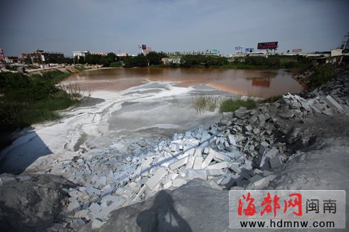 东南网-海峡都市报7月2日讯(本网记者 史国亮 陈秀洪 黄谨 文/图) 南安市水头镇朴三村,一处原本清澈的水塘,最近被石粉填了近十分之一,水上污渍成片、黄白相间。
