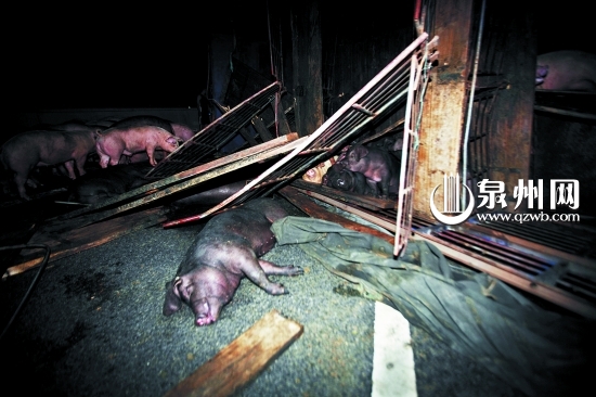 货车侧翻百头猪夜闹高速 交警帮忙调来货车运生猪