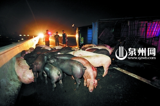 货车侧翻百头猪夜闹高速 交警帮忙调来货车运生猪