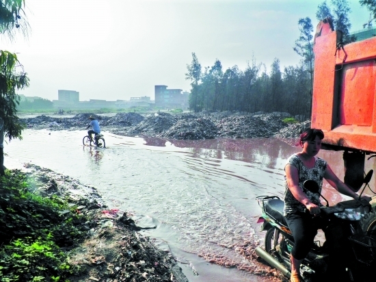 整条土路积满了水,路旁是成堆的建筑垃圾。
