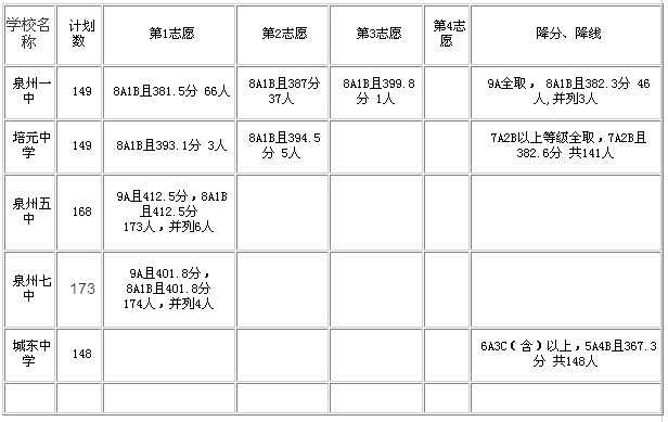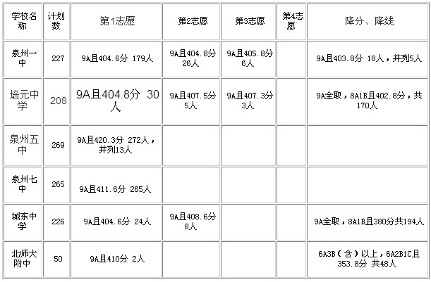 其中,泉州一中、培元中学、泉州五中、泉州七中、城东中学等五所一级达标高中统招生入围控制线为:等级9A且404.6分以上(含404.6分);择校生入围控制线为:9A,8A1B且393分。泉州五中是分数门槛最高的学校,统招线为420.3分。