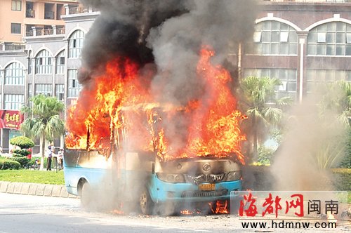 据公交车司机介绍,当时车上有三四名乘客,在行驶过程中,他发现有一股焦味后,便靠边停车,然后打开车内位于驾驶员座位右侧的发动机盖,一股火焰一下就蹿了出来,而且迅速蔓延,难以控制。他赶紧打开车门,让乘客下车,自己接着也跳下了车。消防随后赶来灭火,到上午9点35分时,大火被扑灭。