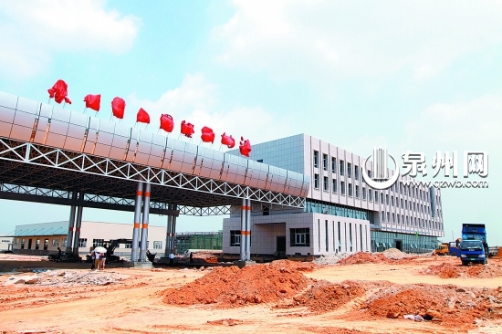 记者驱车从市区出发,到牛山高速公路前的拐角处,便看到了“陆地港”的路标。按照路标行进,20多分钟便到了位于福厦高铁晋江站北侧的晋江陆地港。宽阔的双向六车道、五幢气派的大楼映入记者眼帘,恢宏的气势浑然初现。晋江陆地港首期建设出口监管仓、保税仓、海关检验检疫大楼及其他附属设施,目前已经基本建成,部分楼房正在进行装修扫尾工作。