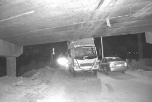 后柜太高 一货车不慎卡在桥底下
