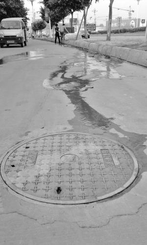 昨天下午,记者来到现场,只见干涩的路面蜿蜒着一条污水痕,长达10多米,且正在不断向周围蔓延,旁边的绿化带边沿,也在污水的洗礼下,留下了一层层污水迹和苔藓。记者跟随污水痕迹找到了冒水的“罪魁祸首”,一个正在不断往外渗水的井盖,尽管冒污水的井盖捂得严严实实,但井底的污水通过井盖上的几个小洞,不断向外冒(如右图),并发出了阵阵刺鼻的恶臭,让过路的行人不得不掩鼻疾走。