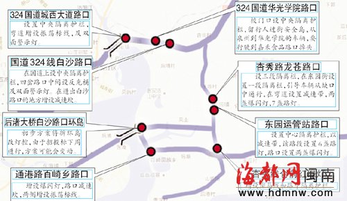 8处事故隐患点分别为国道324线白沙路口、国道324线华光摄影学院路口、国道324线城西大道路口、杏秀路东园运管站路口、杏秀路龙苍路口、杏秀线仑前红绿灯、通港路百崎乡路口、后渚大桥白沙路口环岛。