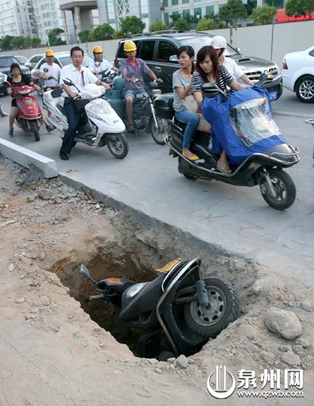 昨日傍晚6时15分,泉州市区刺桐路与泉秀街交叉路口附近,一辆摩托车不慎掉进深坑,车上2名男子跌入坑中,所幸只是受了点皮外伤。