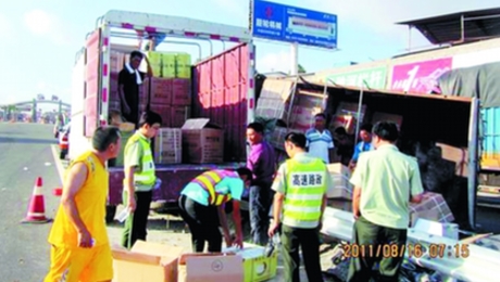 本报讯 昨日5点48分左右,沈海高速公路B道水头出口匝道处一辆满载香烟的货车侧翻,泉州高速交警支队民警赶到现场,却从货车里查获一车假烟,案值超百万元。