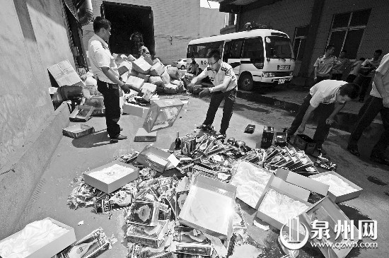 早报讯(记者许小程 通讯员邓志新 文/图)昨天早上,泉州边防支队联合泉州市工商局,销毁一批1000多箱的假冒洋酒、白酒,涉案价值高达200多万元。据悉,这些假酒是相关部门在沿海偏僻地点查获的。