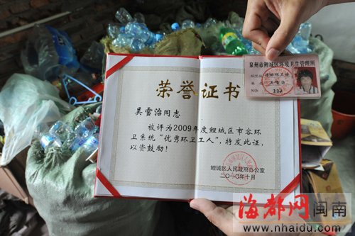 吴女士曾被评为鲤城“优秀环卫工人”