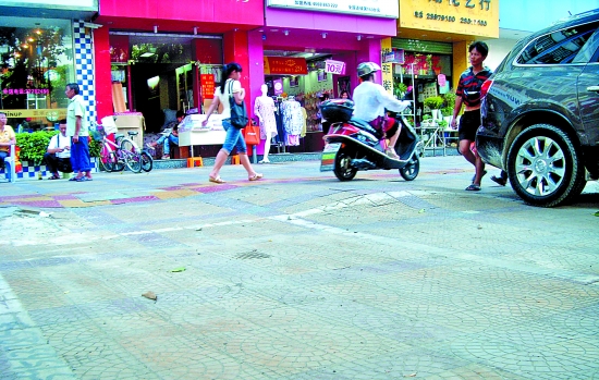 昨天14时50分许,记者在泉秀街看到,两侧用小花砖铺成的人行道,不少已经破裂,部分路段甚至有好几块小花砖不见了踪影,形成大大小小的坑。路边店铺清洗的水顺着地势流到外面的人行道上,形成许多大小不一的浅沟。在泉秀街永相逢超市往西,一段不到50米长的人行道竟然出现十几处破损,有的地方下陷,有的地方拱起,好像是波浪一样。骑电动车的市民通过这里,好似行舟。人行道施划有机动车停车位,不少小车直接开上人行道,地板砖不堪重负,发出“咔咔”的声响。一名停车管理员认为,人行道破损严重,一是地表下陷,二是机动车碾压,三是人行道年久失修。