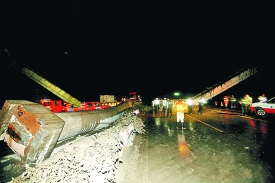 记者今日0时20分赶到现场,五六十米长的引水渠倒塌后,横亘在高速路上,分成几截。引水渠的截面宽1.3米,高1.2米。水泥灌车撞到的桥墩也分成几截,被连根拔起,钢筋裸露。